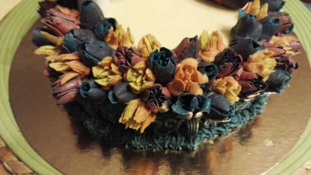 6. ahora es el momento de transferir nuestras hermosas flores!!!!!! Por lo que les llevará de la nevera y con la ayuda de una espátula plana, vamos a eliminar, uno por uno, desde el pergamino papel y se coloca en la parte "cúpula/inclinado" de la torta (ver fotos).
