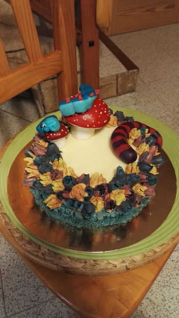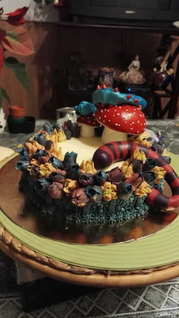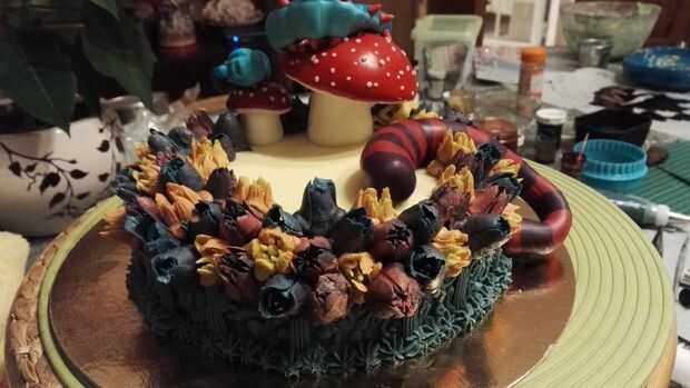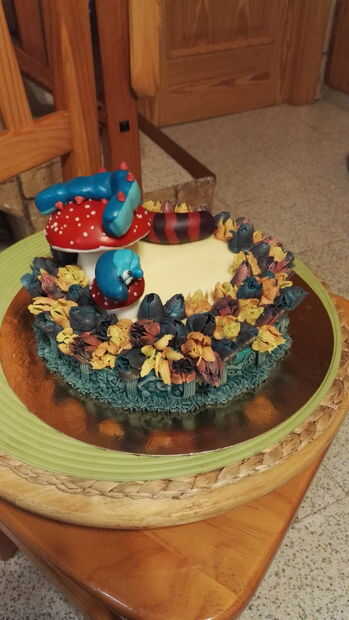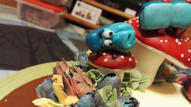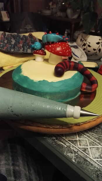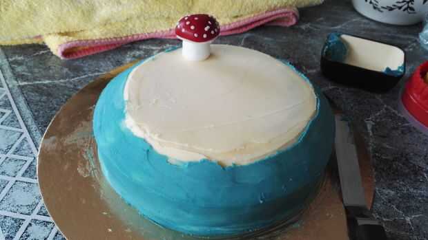 1. colocar las setas en la parte plana de la parte superior de la torta. He hecho 2 de ellos, por lo tanto, si haces esto, ponerlos juntos, ya que representa que la cabeza de la oruga se cae de la seta más grande al más pequeño.