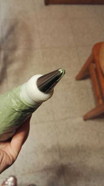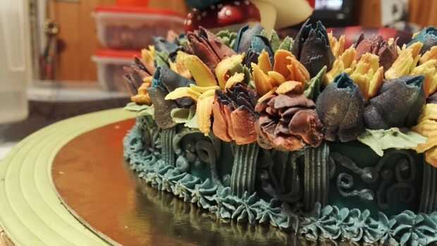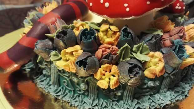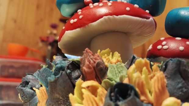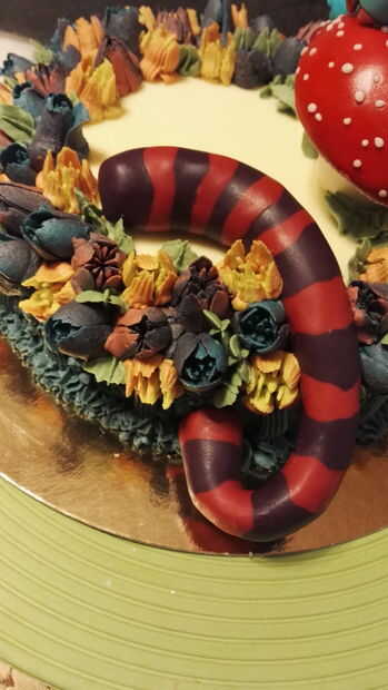 7. con la crema verde nos reservar antes, se tubo algunas hojas (por lo que vamos a utilizar la boquilla de la tubería correcta). Para obtener el mejor resultado, les pie entre las flores, en la parte inferior de los toadstools y alrededor de la cola de gato. Os adjunto muchas fotos para que veáis cómo se ve a este punto.