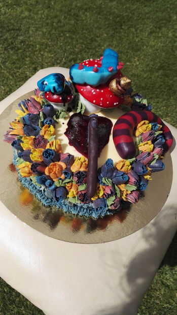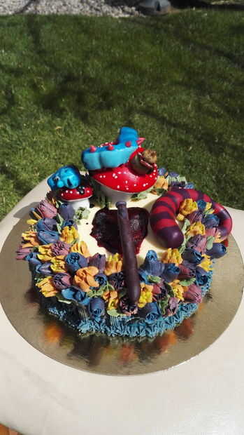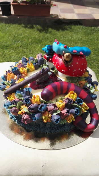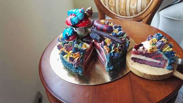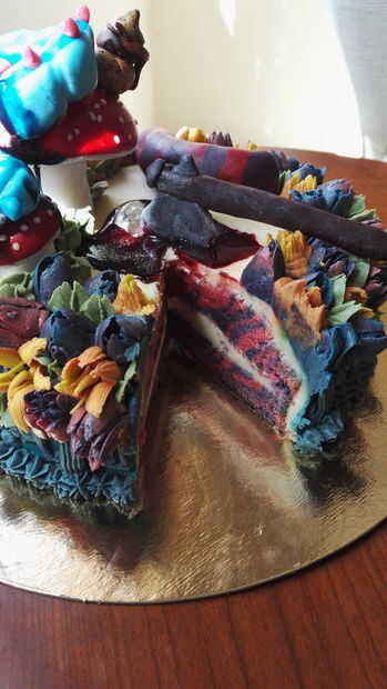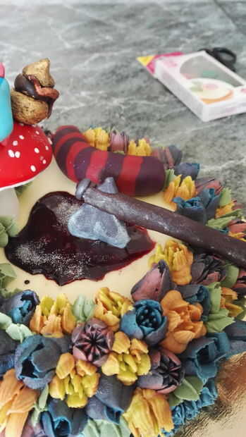 7. puesto que el gato de Cheshire es mágico, su sangre también es, por lo que había espolvoreado un poco de purpurina comestible en la piscina de sangre.