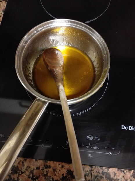 2. Espere hasta que el calor hace que el azúcar y el agua se combinan y cuando empieza a obtener un color dorado, retírelo del fuego.