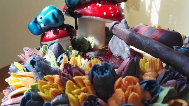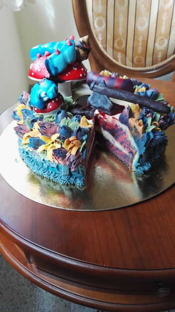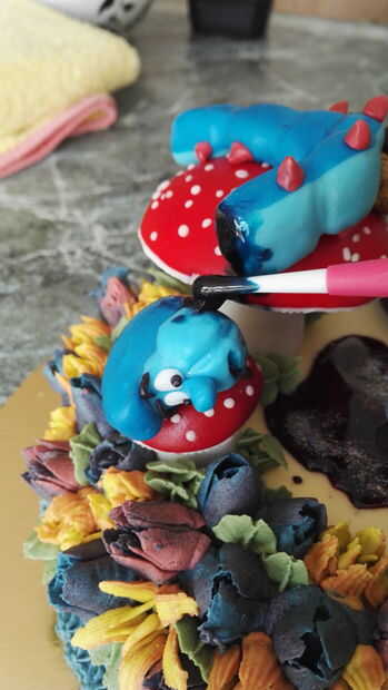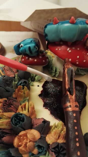 5. con una herramienta de escultura (que son lo suficientemente pequeños) tomar parte de la sangre azul y pintar el "cuello" de la oruga, asegurándose de todo un poco desordenado. También puse un poco de la sangre dentro de su boca, para dar un efecto más dramático. Me gusta cómo gotea de la seta a la torta.