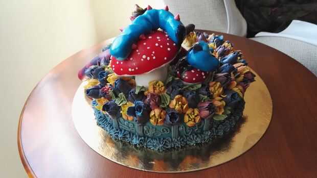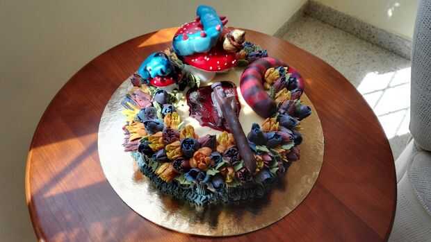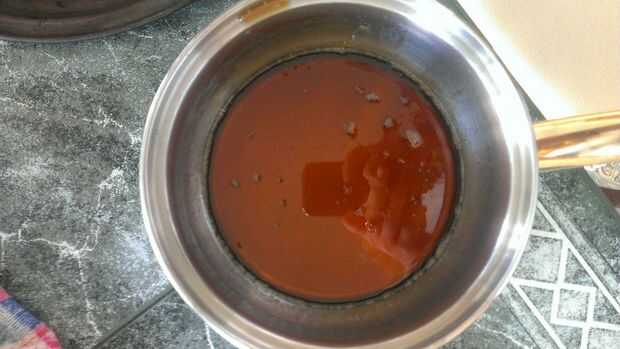 Puesto que se ha cortado la cabeza de la oruga, debe sangrar, así como de la torta sí mismo desde que se apuñala con el corazón en forma de hacha. Para esto usé azúcar fundido siguiendo esta receta: