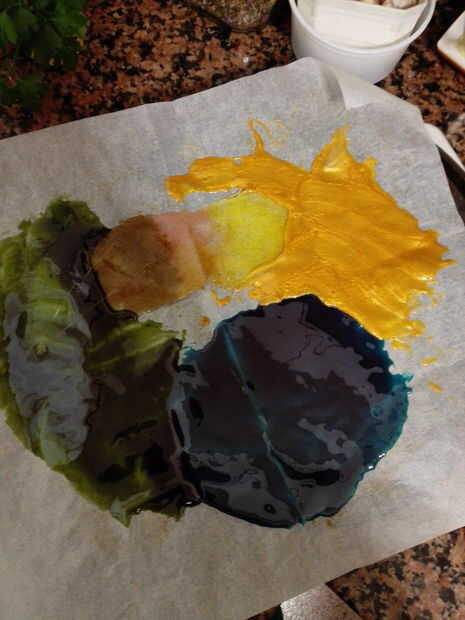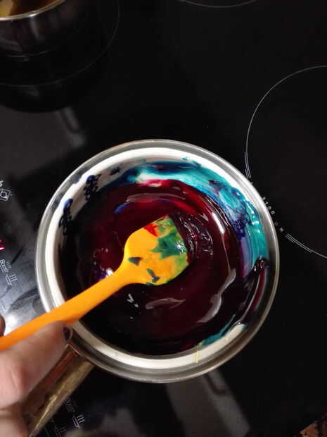 3. divide la mezcla de azúcar en 5; Teñido de 5 colores diferentes (ver fotos) para tener algo de libertad para elegir. Sólo puede partirse por la mitad y 1 mitad azul y 1 medio púrpura-Borgoña del tinte.