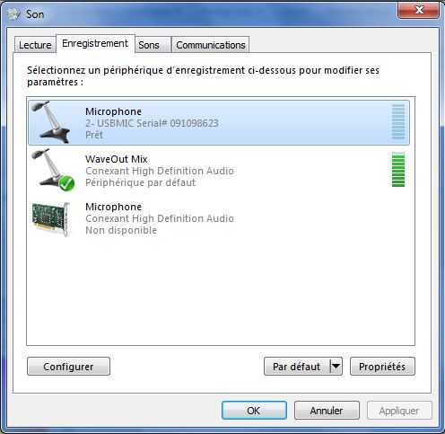 Una vez que la ventana de listado de todos los periféricos de grabación presentes en el equipo demuestran para arriba, debería ver en algún lugar en la lista algo a lo largo de las líneas de "micrófono: 2-USBMIC Serial #XXXXXXXXX": que sería el adaptador USB para sus micrófonos. Haga doble clic, y...