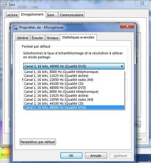 Una vez abierta la ventana de propiedades para el adaptador USB, ir a estadísticas avanzadas y escoja un formato por defecto dispone de 2 canales. Como se puede ver, no decidí ser tímido y recogido lo mejor podía ofrecer: 2 canales, 16 bits, 48000 Hz. probablemente una exageración!