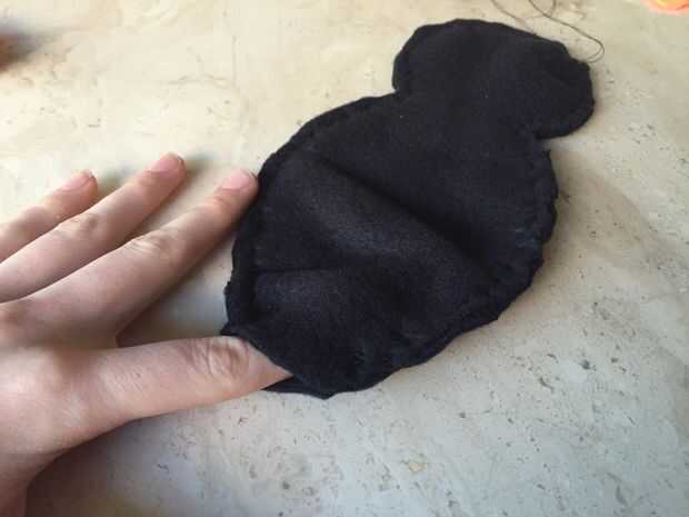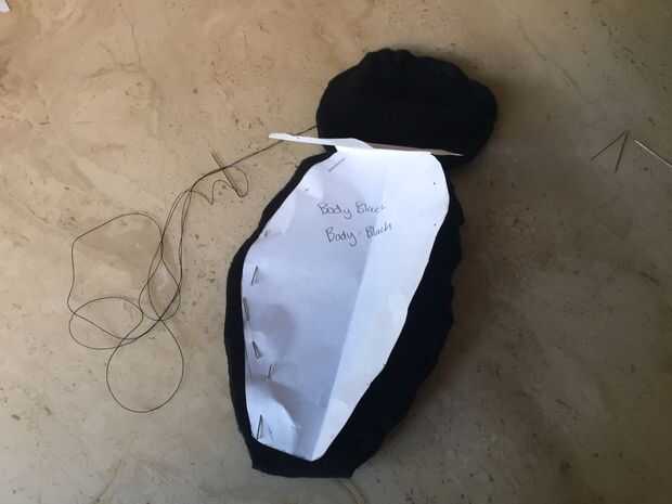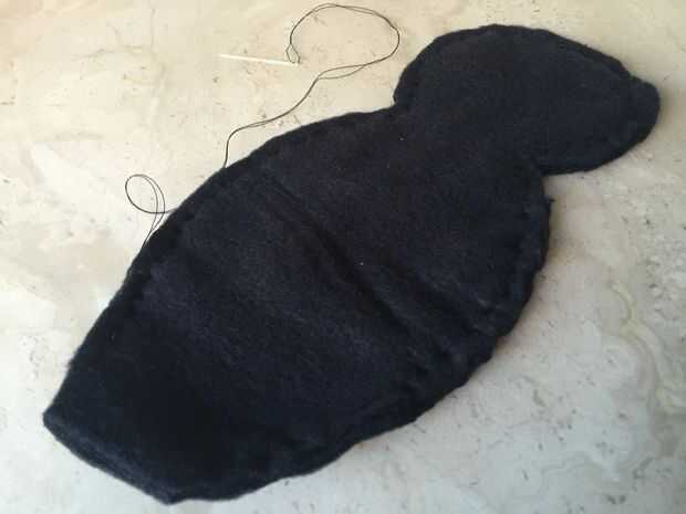 Luego insertar la aguja por la tela (coser ambas hojas de la tela Junta) asegurando que el hilo pasa a través al otro lado. Luego mueve la aguja 2-3mm a lo largo del cuerpo y vuelva a insertar la aguja en la tela, la manera opuesta. Repita este movimiento de costura alrededor de todo el cuerpo, deteniéndose en la parte inferior del cuerpo dejando un agujero en sus patas. Recuerde el patrón de papel y alfileres en el proceso.
