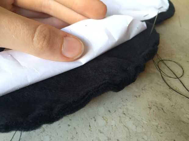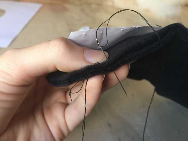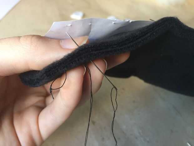 Ahora toma a la tela negro anclada y doblada para arriba e Inserte la aguja en el borde inferior de la tela. No te preocupes si la costura es el más bonito que cuando acabada la tela será ser el revés. al empezar, coser la aguja por el punto de partida de la tela un par de veces tener un establo fijo punto para el hilo.