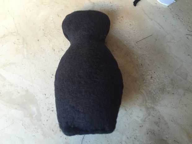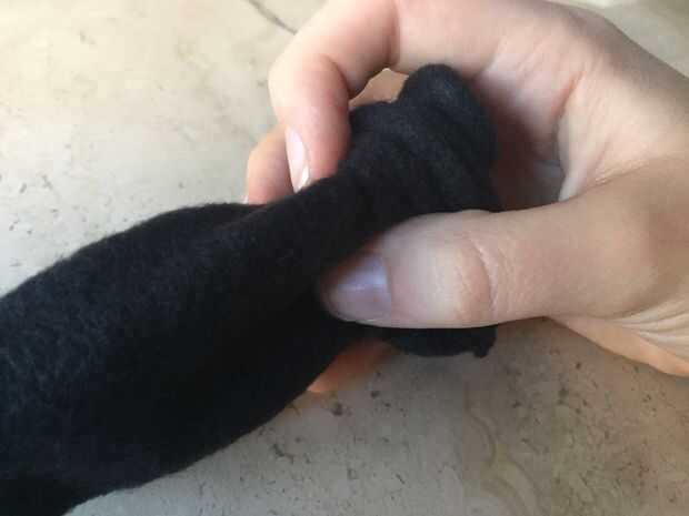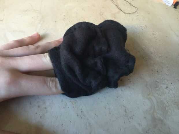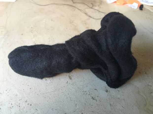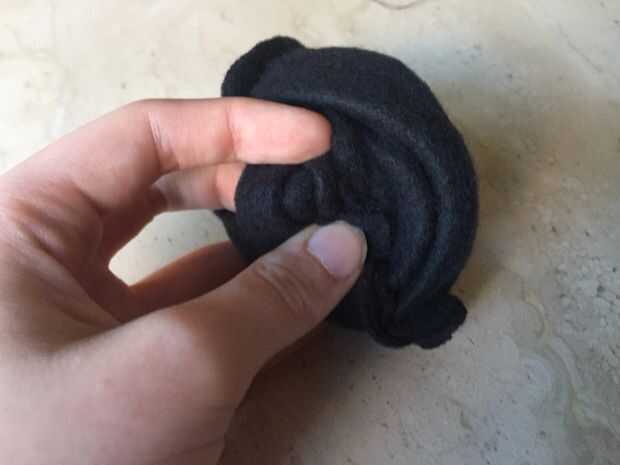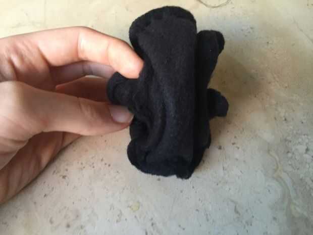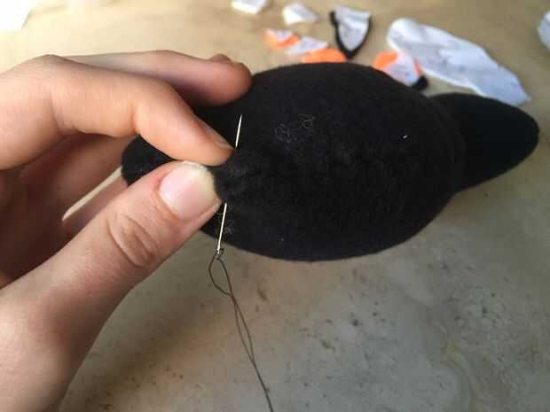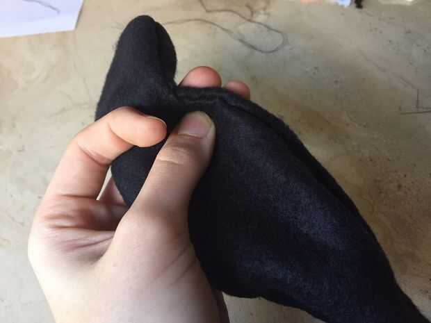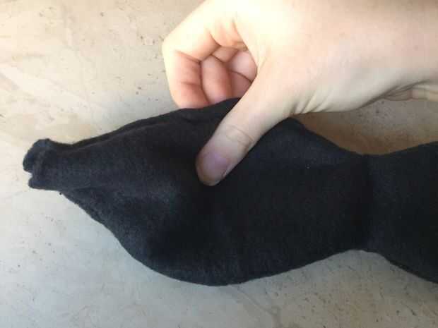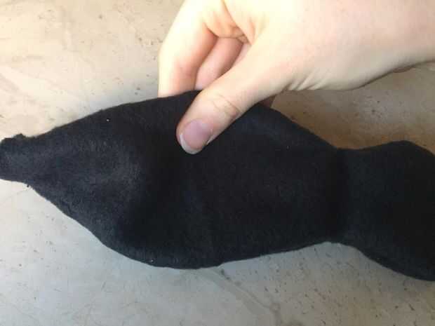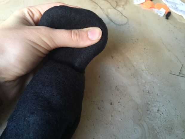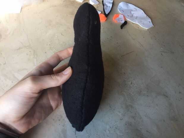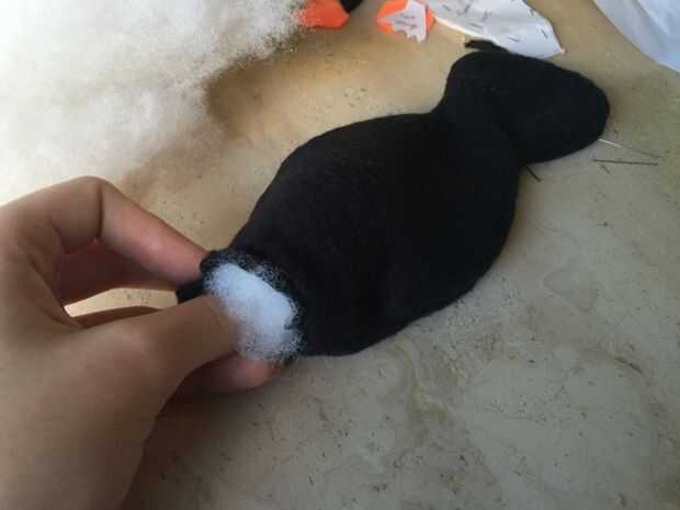 Ahora que el cuerpo se cose juntos (excepto el agujero en la parte inferior) tenemos que voltear el material revés empujando la cabeza a través del orificio en la parte inferior del pingüino. Una vez que se vaya revés a lo largo de los bordes y frotar a la tela hacia fuera tanto como sea posible entre los dedos. Esto asegura que la tela mantiene es la forma de diseño original y da el juguete un borde limpio.