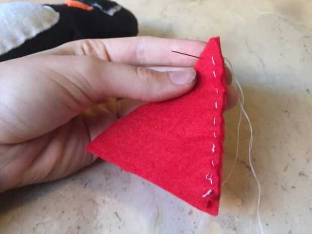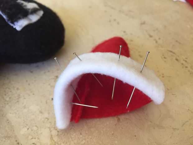 Tomar los dos triángulos rojos de tela y coser con el hilo blanco dejando el borde más ancho del triángulo sin cosido. Girar dentro y frote los bordes de la tela para asegurarse de que son. Luego tomar dos rectángulos blancos de tela, la longitud de la abertura del sombrero y pin en el sombrero. Luego con la tela blanca bien coserlo en el sombrero, quitando los pernos y asegurándose de que los bordes son aún.