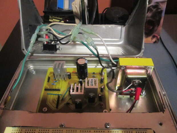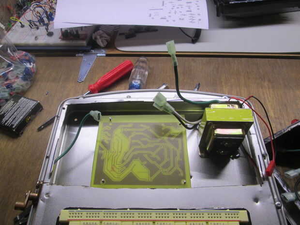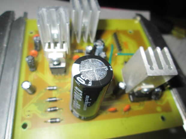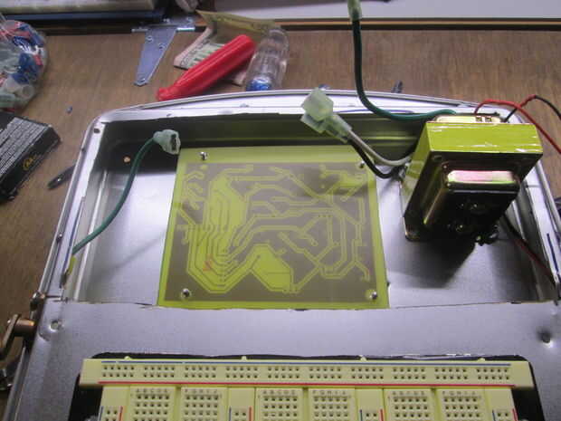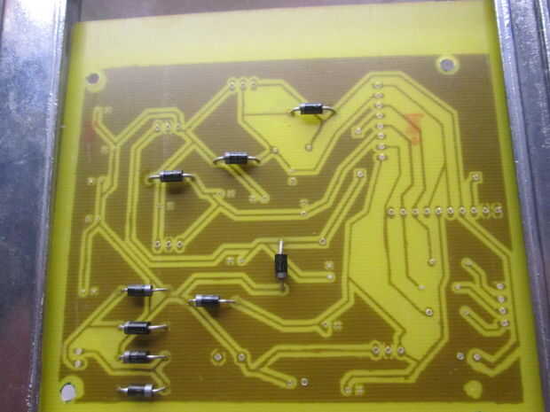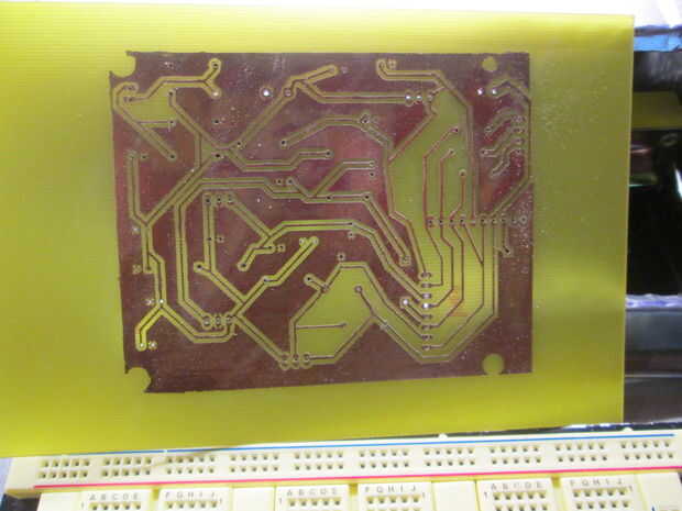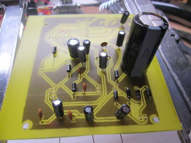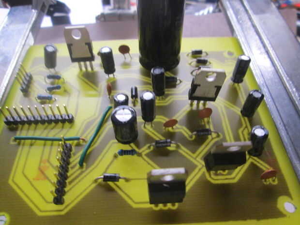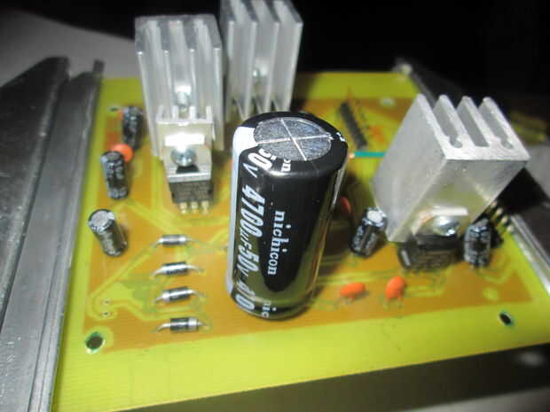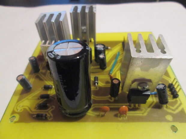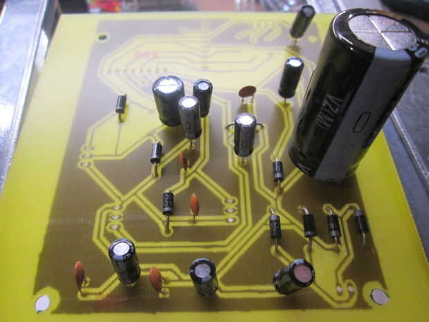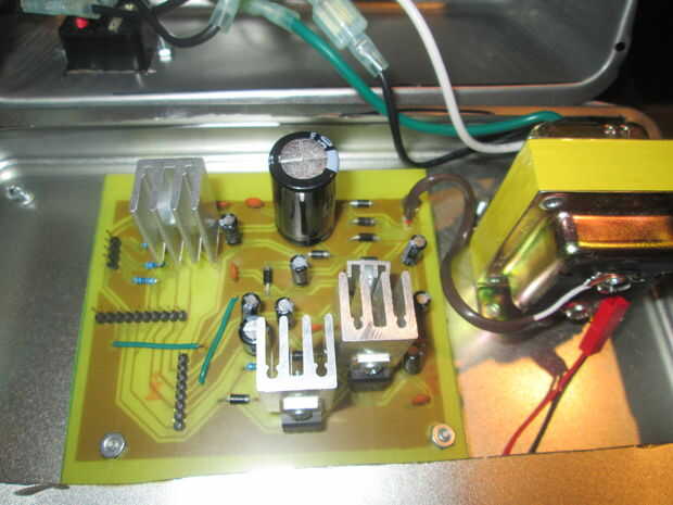 Now fun time. imprimir y grabar la sede PBC imagen 1. Hay un montón de videos sobre cómo hacer esto, he utilizado la prensa y cáscara azul transferencia papel véase el cuadro 2, 3, 4 y 5. Una vez listo el PCB, empezar a soldar todos los diodos 1N4001, 0.1uF condensadores en segundo lugar, el condensador de 4700uF en tercer lugar, resistencias todo cuarto y todos los reguladores de tensión (véase el cuadro 6, 7, 8, 9 y 10). Todos los cables que va al panel frontal del última de la soldadura y asegúrese de que usted identifique cada cable para que no se mezclan. Ahora encontrar un buen lugar para perno abajo la PBC en la marca de caja de los agujeros de montaje y taladrarlos, véase el cuadro 11 y 12. Instale el PBC en su lugar. Y finalmente todos los componentes de panel de alambre a la PBC, véase el cuadro 13 y 14. Ahora prueba el circuito. Conectar en el protoboard alimentado y prueba cada post de enlace para el voltaje adecuado. Ahora atornille en el recinto y pegamento o tornillos del panel frontal y listo. Por fin!!!!!! A continuación he atribuyo la PBC, el lugar del componente, los valores y el diagrama. En el diagrama de cableado hay diodos 1N4004, sustituirlos todos por 1N4001.