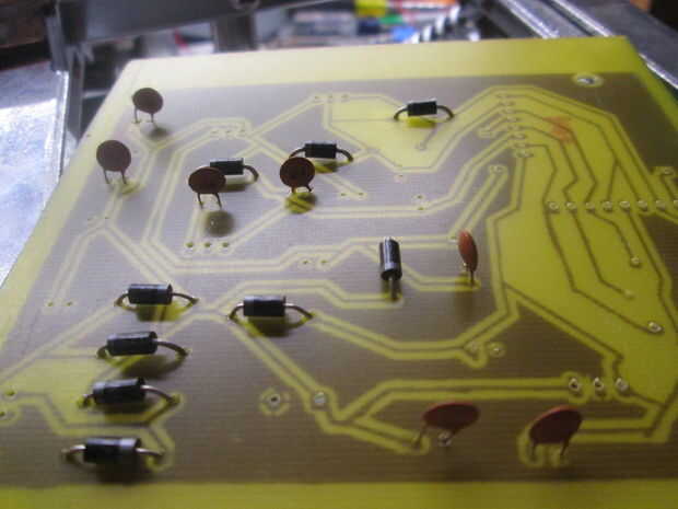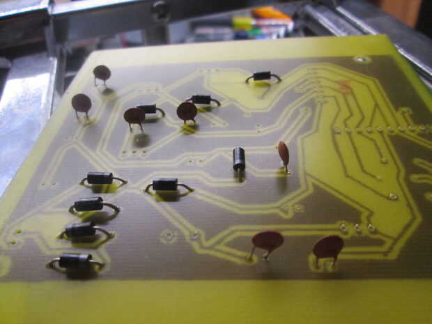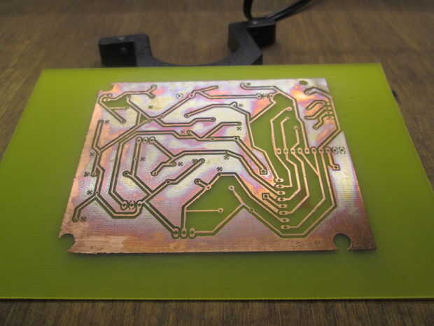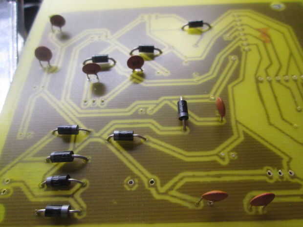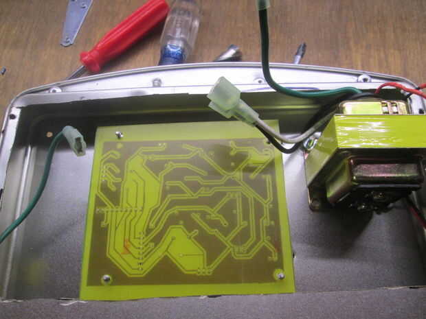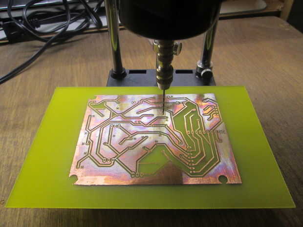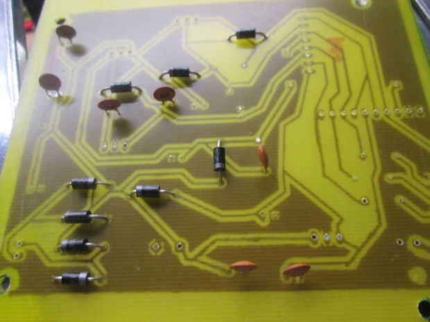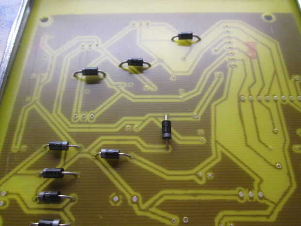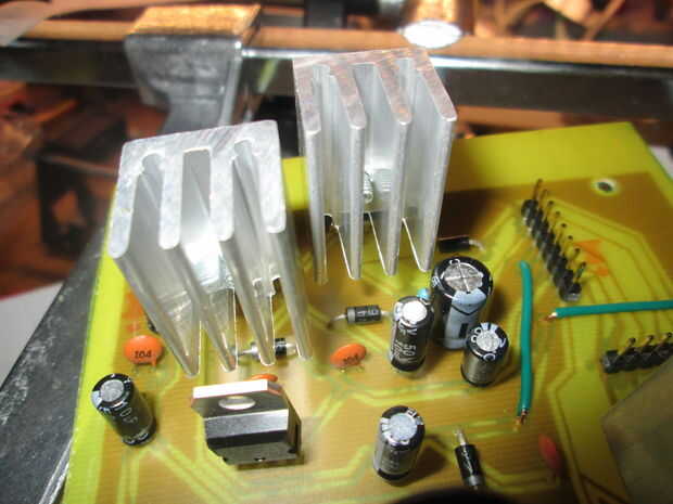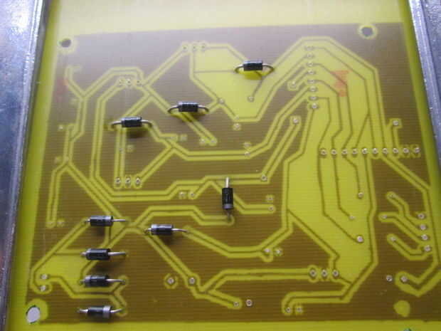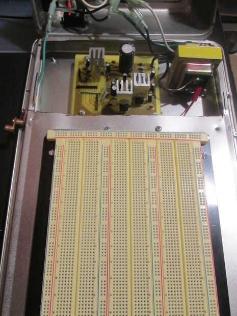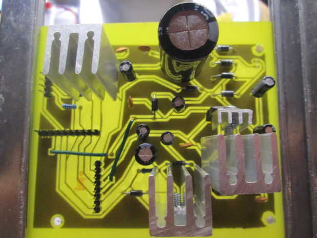 Now fun time. imprimir y grabar la sede PBC imagen 1. Hay un montón de videos sobre cómo hacer esto, he utilizado la prensa y cáscara azul transferencia papel véase el cuadro 2, 3, 4 y 5. Una vez listo el PCB, empezar a soldar todos los diodos 1N4001, 0.1uF condensadores en segundo lugar, el condensador de 4700uF en tercer lugar, resistencias todo cuarto y todos los reguladores de tensión (véase el cuadro 6, 7, 8, 9 y 10). Todos los cables que va al panel frontal del última de la soldadura y asegúrese de que usted identifique cada cable para que no se mezclan. Ahora encontrar un buen lugar para perno abajo la PBC en la marca de caja de los agujeros de montaje y taladrarlos, véase el cuadro 11 y 12. Instale el PBC en su lugar. Y finalmente todos los componentes de panel de alambre a la PBC, véase el cuadro 13 y 14. Ahora prueba el circuito. Conectar en el protoboard alimentado y prueba cada post de enlace para el voltaje adecuado. Ahora atornille en el recinto y pegamento o tornillos del panel frontal y listo. Por fin!!!!!! A continuación he atribuyo la PBC, el lugar del componente, los valores y el diagrama. En el diagrama de cableado hay diodos 1N4004, sustituirlos todos por 1N4001.