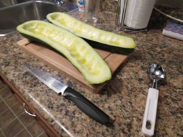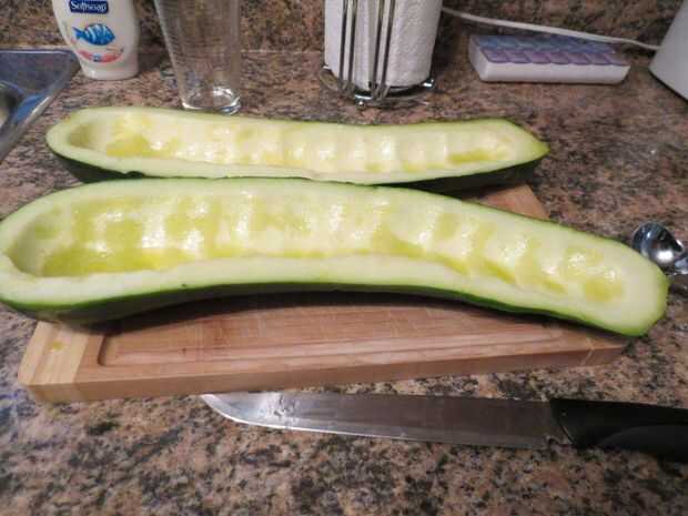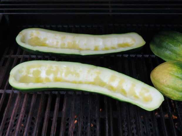 tomar su gigante calabacín y la calabaza, cortar por la mitad, sacar las semillas y pincelar con aceite vegetal u oliva. corte a lo largo de la parte que se sienta completamente.