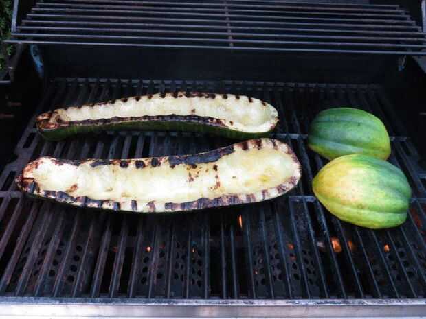 empezar a calabacín y calabaza de bellota en la piel de barbacoa