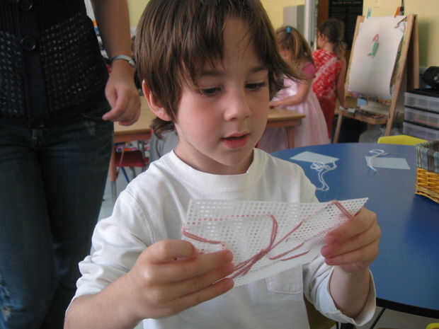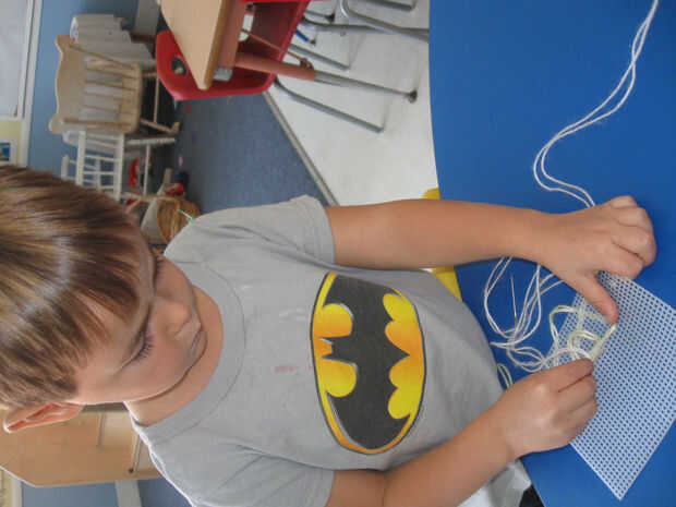 Con niños pequeños, es importante permitirles explorar un medio antes de intentar darles instrucciones específicas. Son muy curiosos y necesitan entender cómo funcionan las cosas antes de estar cómodos con la construcción de nuevos conocimientos. Así que pusimos cuadrados/rectángulos pequeños de lona plástica con hilo y agujas grandes, romos. De antemano, que la aguja en el centro del pedazo de hilo de rosca y atados ambos extremos del hilo alrededor de una esquina del lienzo, para que no caiga la aguja. Dejamos que la práctica de los niños-sin instrucción, a menos que se pide-por lo que podrían calcular hacia fuera cómo colocar las manos, cómo ser precisos con la aguja y cómo tejer adentro y hacia fuera en un movimiento de costura. Algunos niños enseñaron otras puntadas que aprendieron fuera de la escuela y crearon diseños interesantes. Después de cada sesión de práctica, los lienzos fueron sin cosido por los profesores para que podemos reutilizarlos en la próxima sesión de práctica.