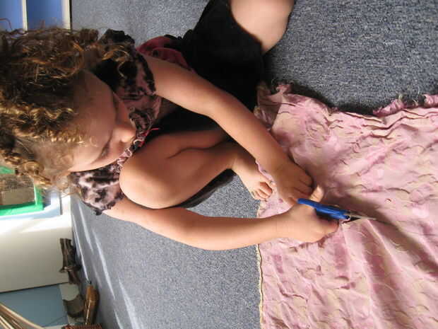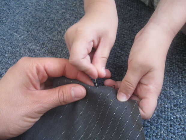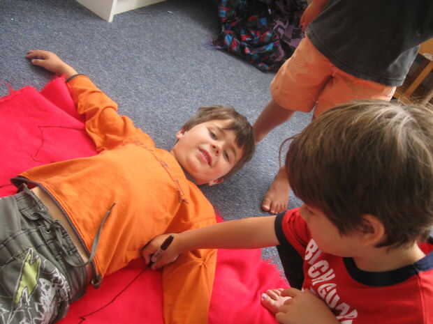 Una vez que la tela fue seleccionada, llegó el momento de medir, cortar y fijar la creación para que nosotros podríamos coser. Pedimos a los niños cómo pensaban que podíamos medir las prendas. Algunos niños sabían de cinta para medir, por lo utilizamos lo mejor de su capacidad; Algunos pensaban que debemos rastrear sus cuerpos, que trabajaban, también; y algunos probada libre dibujo a mano, a menudo esto tomó varios intentos, pero nunca cortamos hasta que parecía que le cabe cuando al cuerpo. Después de que el diseño se dibuja hacia fuera sobre la tela, los niños fueron a trabajar cortando. Entonces, cubrió hasta las orillas que debían ser dobladillado o costuras que necesitan para ser cosidos.