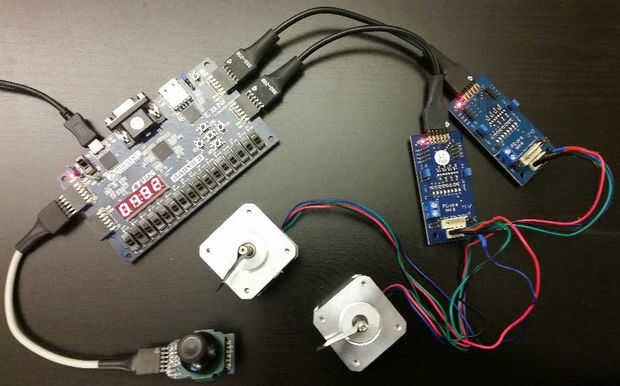 Conecte el PmodJSTK en el nivel superior del Pmod puerto JA, PmodSTEPS en puertos Pmod JB y JC y los servos en el PmodSTEPs.