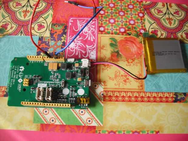 Poner los cables en los agujeros 4 º y 6 º en la parte superior del Linkit. Enchufe el la batería de ion en la parte superior derecha de la tabla como se muestra en la imagen