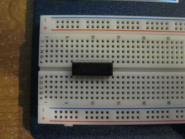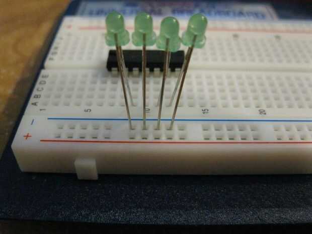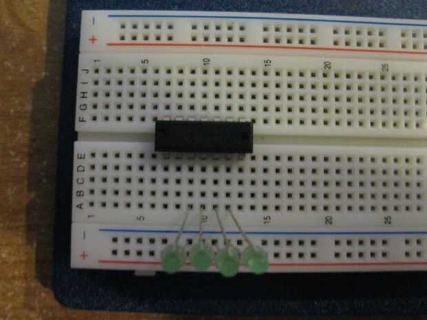 Para empezar, el chip va en el tablero de pan, y luego cuatro LEDs se vinculó de pins de datos 1-4 para un conductor común (no por tierra, sin embargo).