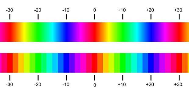 Y así sucesivamente. Estos colores base se atan a Celsius grados (-30 -20, -10, 0, + 10, vea la tabla) y cambiar sin problemas. Así que si ves, digamos, un cian – es entre verde y azul, alrededor de-15 ° C; una tonalidad púrpura significa algo alrededor de-5 ° C. La gama del espectro completo de rojo cubre 30 grados y luego vuelca, eso es suficiente no para confundir a las lecturas (una caída de temperatura durante la noche de 30° C o la subida es bastante raro y en cualquier caso puedes mirar por la ventana para conseguir la idea básica de lo que está sucediendo).