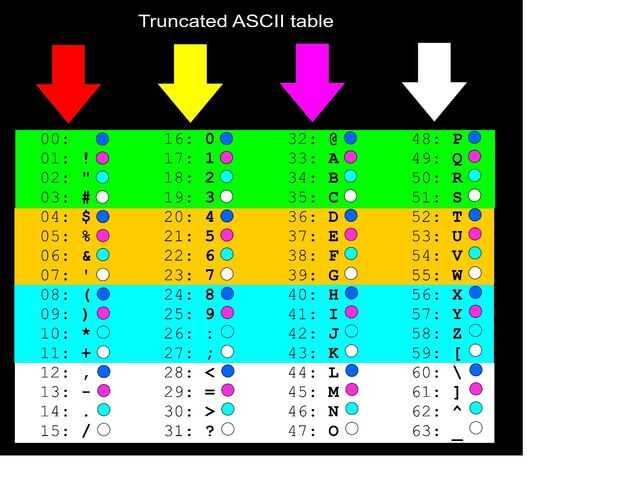 Técnicamente no estamos limitados a 6 bits: podemos añadir un cuarto color, usando rojo otra vez como el portador y transmitir bytes completos. El problema aquí es que hay dos colores en medio de la secuencia, y si son la misma (como, digamos, en B00111100 – rojo, blanco, blanco, rojo o B00011000 – rojo, cian, cian, rojo), puede ser difícil decodificarlos. Afortunadamente, 6 bits son bastante suficientes para la transmisión de mensajes significativos.