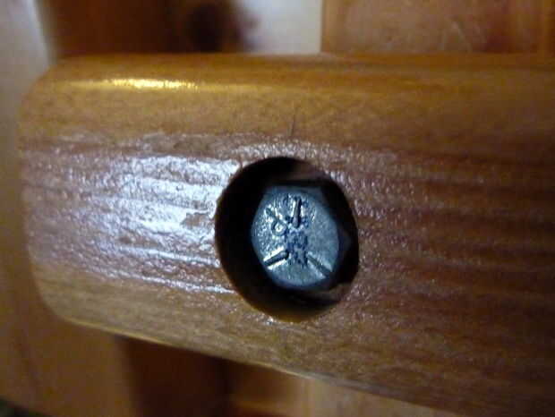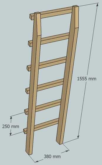 Ciertamente menos puedes elaborar escalas que se muestra aquí. Éste utiliza un pasamanos de cicuta como peldaños y dos en ángulo 2 x 3 como barras verticales. Los peldaños fueron Unidos a los montantes mediante tornillos de cabeza avellanada 1/4"(ver foto). Tornillos más largos fueron utilizados para el peldaño superior para fijarlo a la litera. He encontrado la escalera fáciles de hacer en su lugar, trazando todos los bits que necesitaba para cortar. Una escalera vertical habría sido más fácil, seguro.