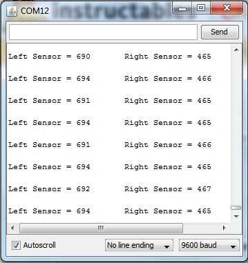 Este código puede leer los valores de los dos sensores de luz y luego mostrarlas a través del monitor serie. Esta es la primera parte del robot. Posteriormente usaremos los valores del sensor de luz para control de motores por consiguiente.