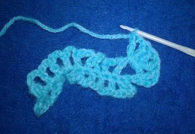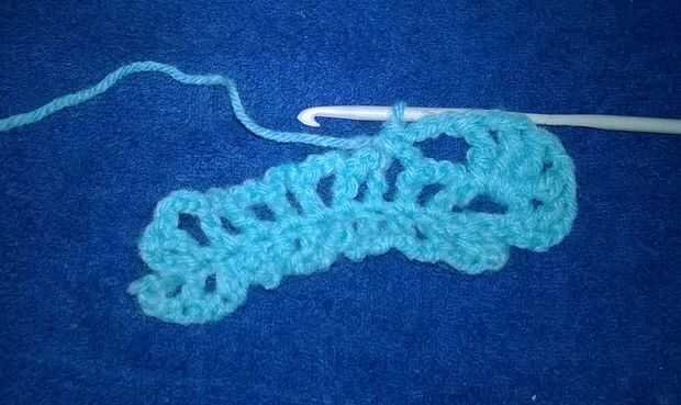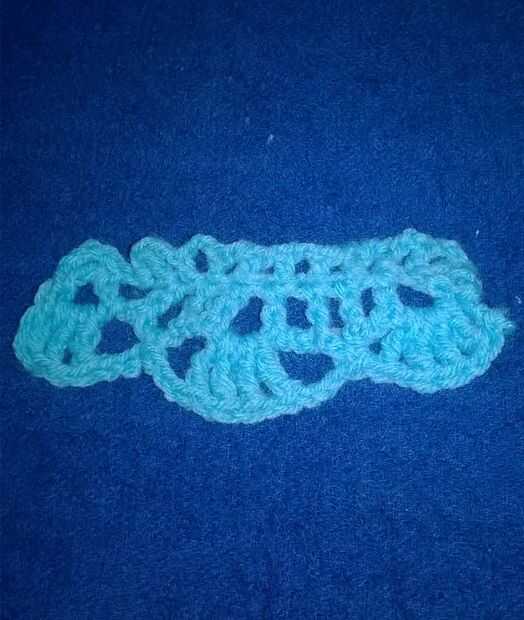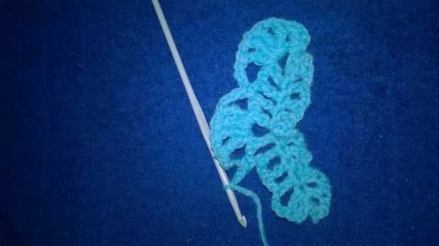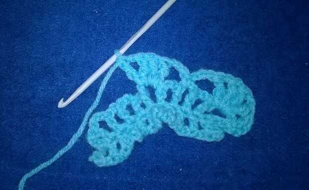 Fila 4 - Ch3, vuelta, DC en primer st. Luego en el bucle creado a partir de la fila anterior (TC, Ch1, TC, TC, Ch1, TC), * Ch3 lazo de saltar 1, SC en el siguiente bucle, Ch3, saltar 1 lazo, en el siguiente lazo (TC, Ch1, TC, TC, Ch1, TC).