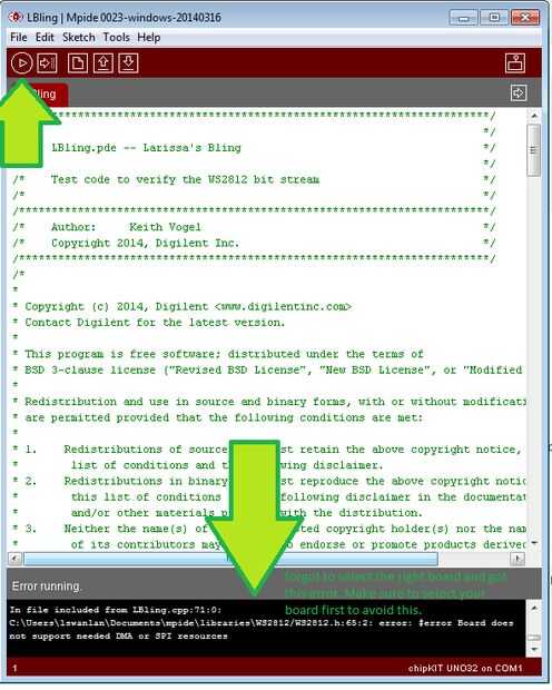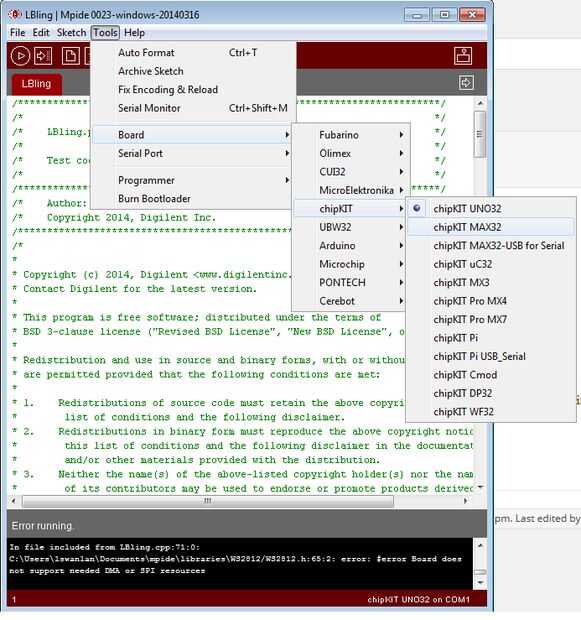 Una vez que tengas el ejemplo LBling abrir, vaya a herramientas y seleccione la Max32 (o el WF32) Junta.