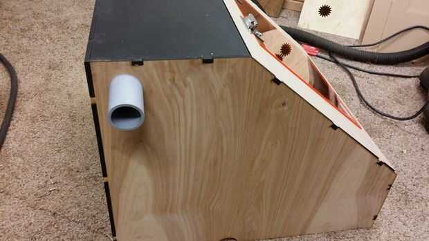 Por último, cortamos un orificio en el lado de la caja para insertar una manguera de vacío. De esta forma podemos ejecutar el vacío mientras utiliza el láser para bombear cualquier humo, humos al aire libre.