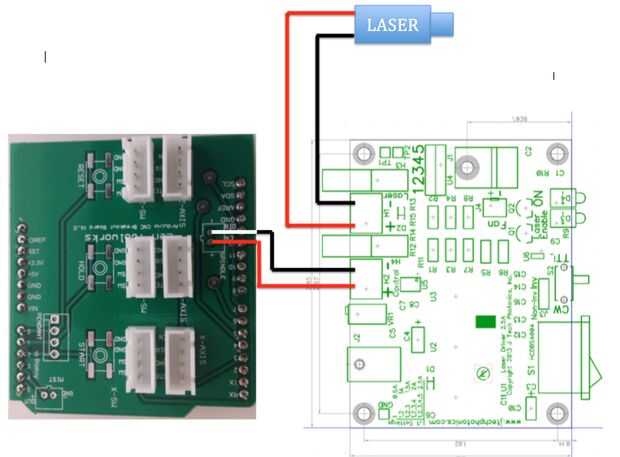 - Siguiendo el esquema incluido (uno con la placa verde), conecte los cables del láser al Terminal de "Láser" de la Junta de láser. Asegúrese de que el cable rojo va en el terminal positivo y el cable negro va en el terminal negativo.