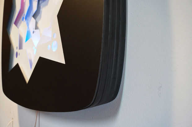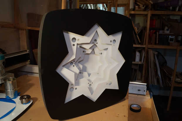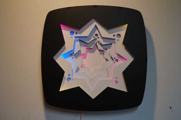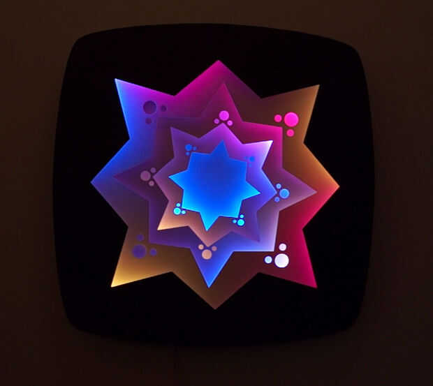 Obra de arte es parte de una serie más grande que involucra conceptos de resolución perceptiva. Este trabajo es 23" a través y se construye de 9 alternas capas de Material compuesto de aluminio (ACM, en 3mm de espesor) y panel de espuma de PVC (1/2" de grosor). Hay 4 capas de tiras de LED RGB (WS2812B 30 por metro) que proyectan su luz a través de cada una de las capas internas de la obra de arte. Los LEDs están controlados con un Teensy 3.1 (PJRC.com) y una tarjeta micro SD que almacena imágenes digitales (puede ser cualquier imágenes digitales, pero ciertos detalles y trabajo de paletas de color mejor que otros). Las imágenes digitales se abstraen en el eje del tiempo para producir un color suave, constante cambio de paleta. El controlador se incorpora en una de las capas. Las capas están diseñadas en Adobe Illustrator y corte en una fresadora CNC (CAMaster Stinger II).
