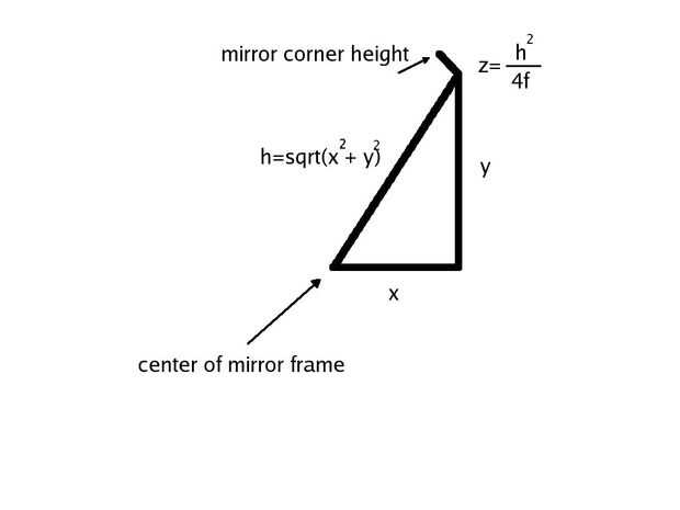 Lo que pasa es que cuando llegas pasado que la fila 3 hacia fuera del centro es que la distancia de cada tornillo comienza a conseguir más grande que el tornillo largo. Esto no es realmente un problema. El truco es para compensar todos los lados de un espejo dado que el borde más bajo es tan bajo como usted puede hacerlo. Lo que se consigue es filas de espejos en el mismo ángulo, pero no en el mismo plano. Esto es similar a una lente de fresnel para aquellos que entienden la óptica.