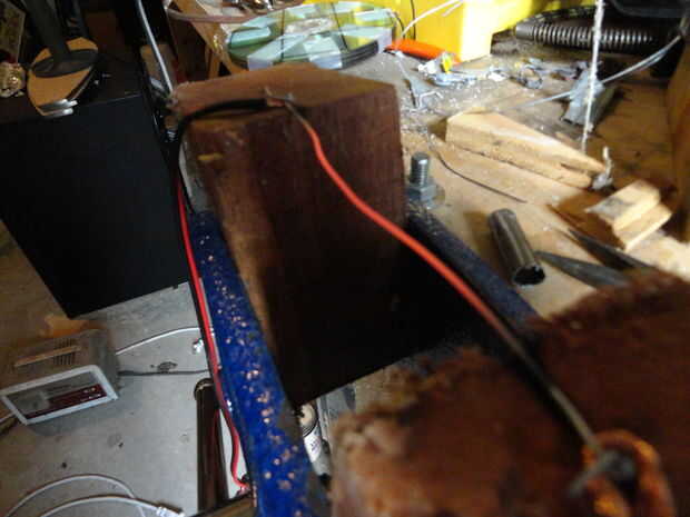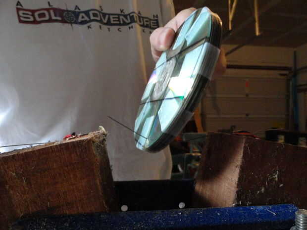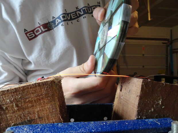 pensé un alambre caliente sería la manera perfecta para cortar a través de estos discos de plástico. He probado con un CD, un trozo de cuerda de guitarra y dos baterías de plomo ácido. Que no sea el CD de coger en el fuego donde contacto con el cable Esto funcionó bastante bien.