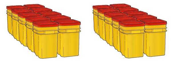 Yo estoy recolectando 20 cubos de litera del gatito del mismo tamaño y marca (tiene cinco hasta ahora). En primer lugar, voy arena exterior para quitar las etiquetas y la preparación para la pintura. Entonces yo a llenar cada cubo con botellas de plástico sellados, vacíos. Si cualquier cubo de uno brota una fuga, las botellas servirá como bolsas de aire para mantener la flotación. Finalmente, te aplique una tira de sellador de silicona a lo largo del labio de cada cubo, cerrar herméticamente, dejar que la silicona seque y luego terminar el cubo con una envoltura de cinta adhesiva alrededor del borde, para proteger la goma de silicona.