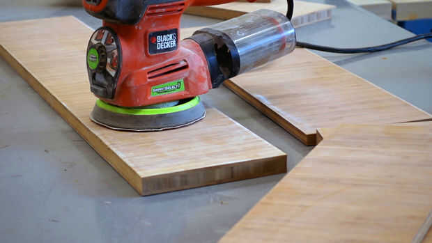 Primero tuve que preparar cada tablero lijado, usando una lijadora para despegar la capa existente de sellador y arañazos. Utiliza papel de lija grano 100 para el sellador de lijado y luego remató con grano 250 para el paso final.