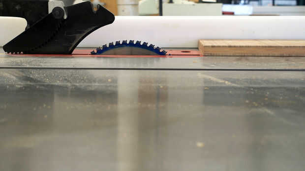Si la Sierra de mesa tiene un protector de contragolpe que tendría que quitar para los próximos pasos.