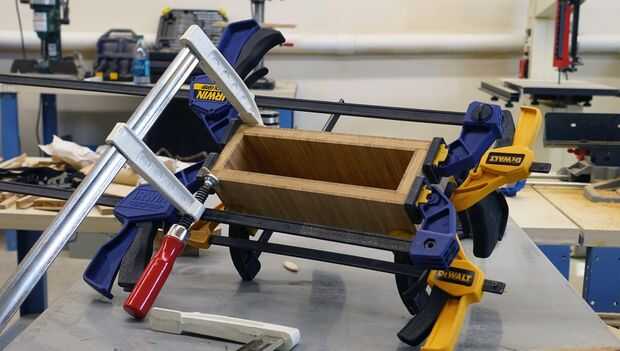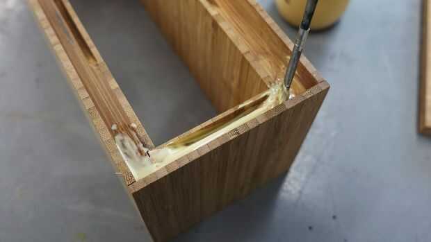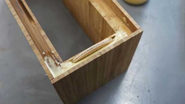 En primer lugar aplicar pequeña cantidad de pegamento en un campos de galletas y con un cepillo viejo para difundir, aplicar más pegamento si es necesario. Yo estaba junto a una pared en un tiempo y luego terminó la pieza de abajo a la vez. En este punto, ayuda a trabajar rápido para que el pegamento no se seque. Después de eso, puse las galletas de madera en las ranuras y aplicar más pegamento sobre la articulación opuesta separarse alrededor con un cepillo. Que el uso de un mazo de goma, ligeramente girada alrededor de toda la pieza, asegurándose de que no hubo espacios. Por último, con pinzas para cada esquina, había apretado todo y deje que se seque.