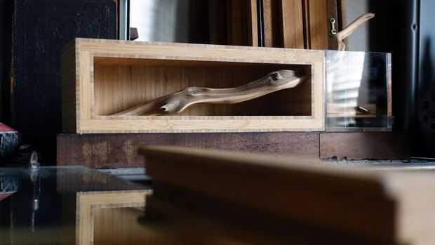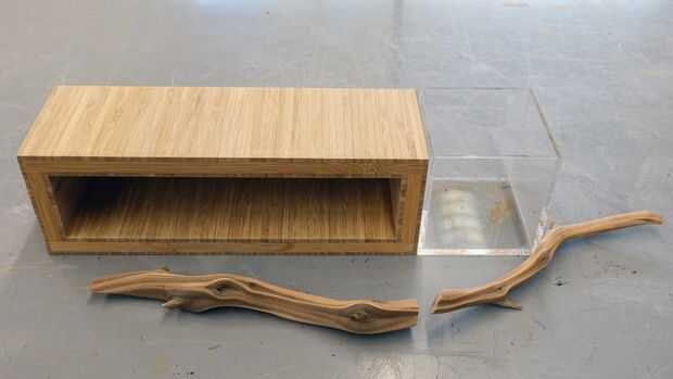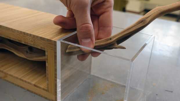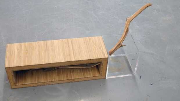 Para finalizar la pantalla, corté un pedazo de madera en secciones que encajaría en las cajas y pegan en su lugar. Esto dio el aspecto que la madera fue piercing por ambas cajas.