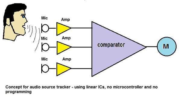 3 señales alimentan un circuito comparador, que asegura motor motores hacia la dirección donde mic recibido señal más fuerte.