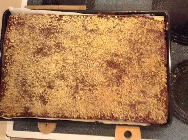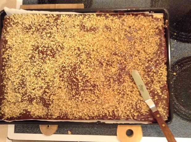 Tuercas de 1/2 taza picada espolvorear 1 uniformemente sobre el chocolate derretido, cubriendo toda la zona.