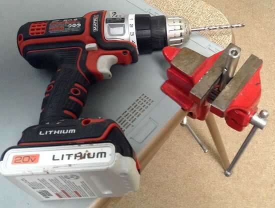 Quieres un agujero que es 13/64" de diámetro. Montaje de la mordaza y perforarlo. Puedes ver que yo tengo la mía un poco descentrado, puede que desee tener un punzón para que el taladro comienza correctamente en medio de su material. Se debe taladrar el agujero al menos 3/8" de profundidad. Más profundo es aceptable, pero no menos profunda. Se necesita de suficiente profundidad para obtener un hilo de buen corte en el material.
