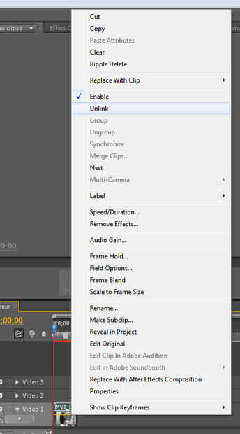 Para quitar el audio del clip de película, haga clic derecho sobre el clip y seleccione Desenlazar (Unlink). Esto hará que el audio y video separadas entre sí por lo que se puede borrar uno de ellos si quieres.