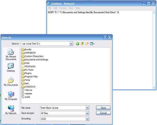XCOPY "E:\" "C:\Documents and Settings\Neo\My Documents\Flash Drive" /S