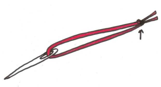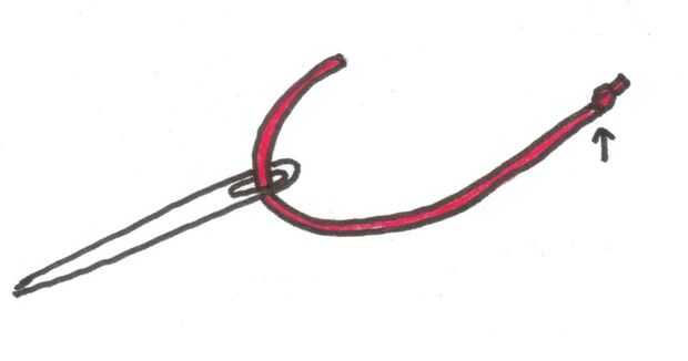 Esto es bueno usar si estás preocupada que te equivocarás. Es muy fácil de sacar la aguja y descoser unas puntadas, entonces sólo vuelva a enhebrar la aguja y continuar. Usted necesita mirar hacia fuera que usted no tire el hilo de la aguja por accidente al coser aunque, o el extremo libre enredado en los puntos de sutura. La flecha te muestra cómo hacer el nudo.