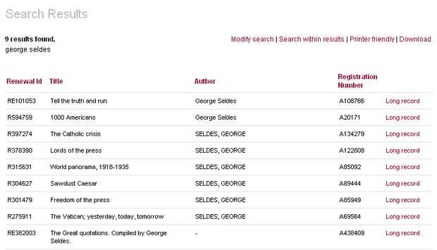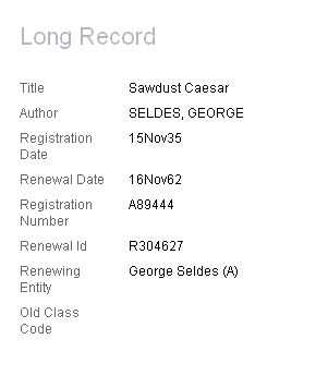 Este catálogo ha encontrado un registro de renovación de 1962. En 1962 se amplió el autor inicial de este libro de 1935, lo que significa que habría entrado en el dominio público en 2010 pero debido a otros actos de derecho de autor (que no quiero entrar) probablemente entrará en el dominio en el año 2030 (al menos).