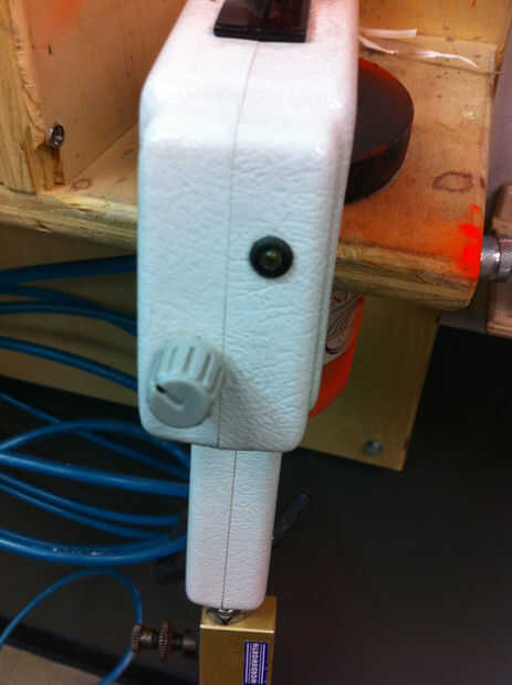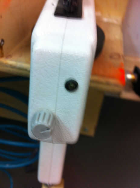 Gire la perilla de ajuste de KV (en la parte posterior de la pistola) y el polvo de alimentación perilla de ajuste (parte inferior de la pistola) hacia abajo, girando ambos hacia la izquierda como puede.