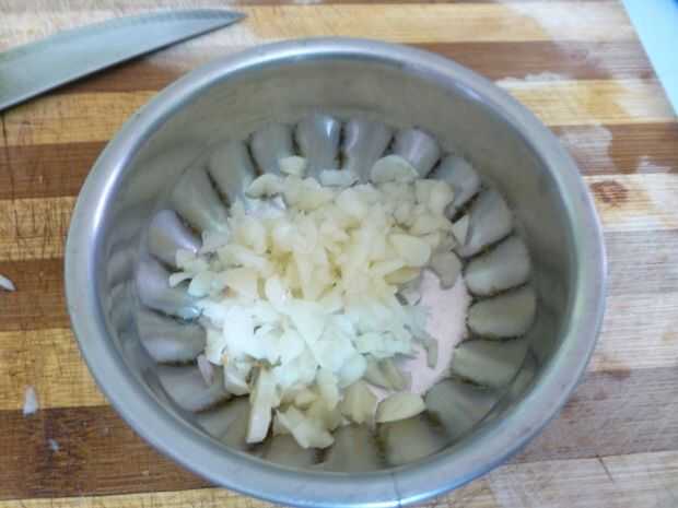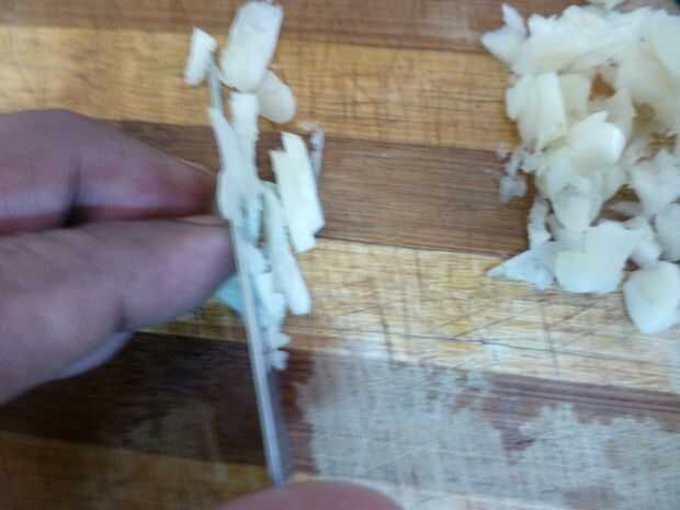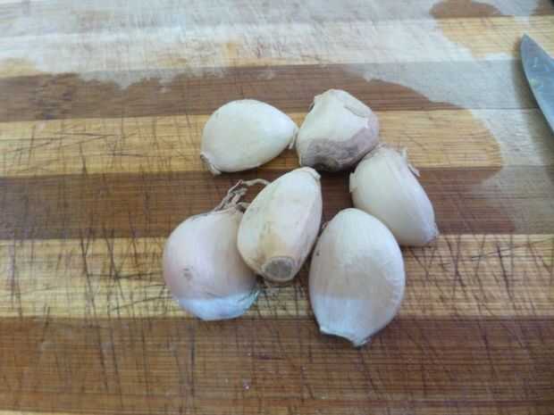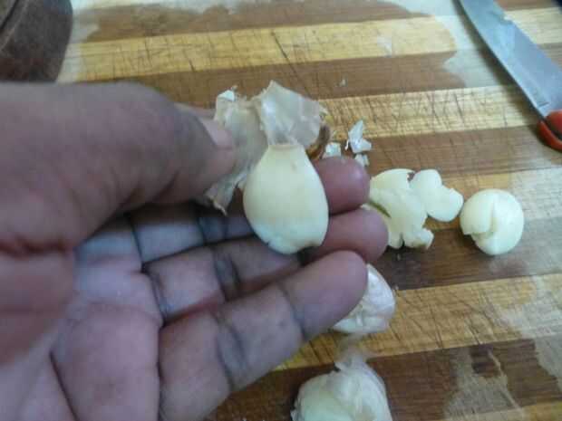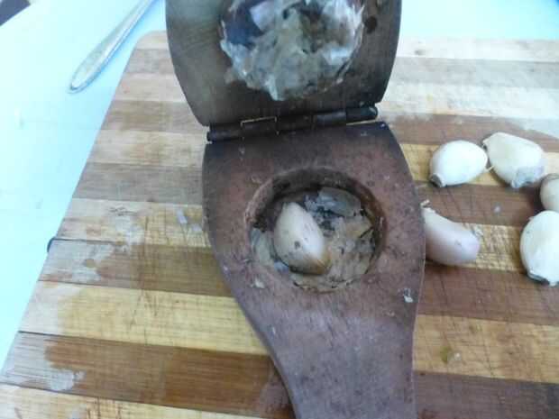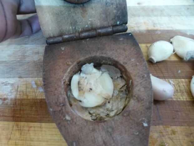 Utilizamos un exprimidor de madera para abrir el ajo. Colocar cápsulas de ajo en el exprimidor y la prensa, eso es todo. Puede quitar piel de ajo fácilmente. Como la cápsula de ajo es triturada, usted puede cortar en trozos pequeños con el cuchillo.
