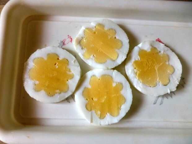 Últimos dos cuadros mostrar cómo puede hervir huevos usando moldes diferentes y por separado hervir huevo primero y luego la yema dentro del blanco en parte hervida