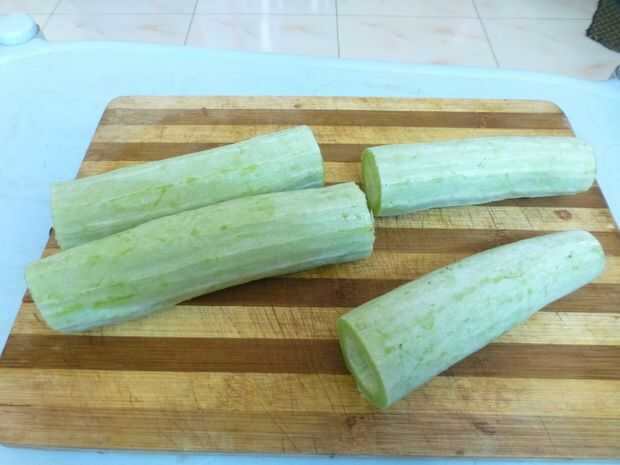 Es muy difícil trabajar con gran tamaño verduras como calabaza, calabaza de botella y calabaza de la serpiente. Cortarlas en trozos más pequeños realizables para que pelar, quitar las semillas y corte se convierte en fácil. Utilizamos un cuchillo tamaño grande para rebanar verduras grandes como calabaza y calabaza de botella. Cortar una larga calabaza de la serpiente de seis pulgadas piezas es muy fácil de limpiar y picar.